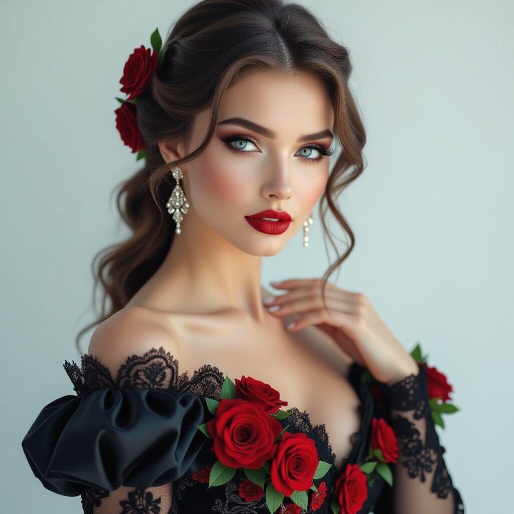 A captivating image of a woman in a dramatic rose-adorned dress. The portrait features cinematic lighting, intricate digital enhancements, and an ethereal atmosphere.