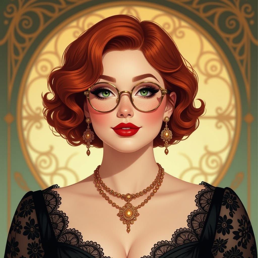 This image shows a charming, full-figured woman with striking features and red hair. She is wearing glasses and copper jewelry, dressed in a black lacy dress, in an art nouveau style.