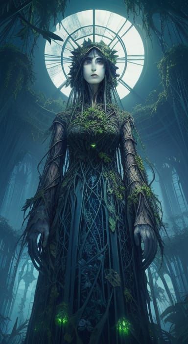 An abandoned, overgrown Victorian greenhouse, now housing a colossal, sentient crystal formation pulsing with internal light. Bioluminescen...