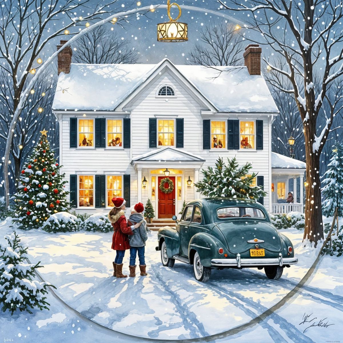 A watercolor disc ornament depicting a snowy small-town Christmas scene with a colonial house, vintage car, and family. Evokes a nostalgic, Rockwell-esque holiday feel.