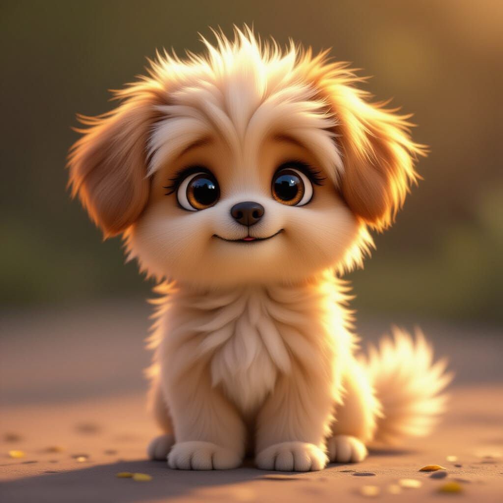This CGI render features a fluffy, silky dog with large, expressive eyes, bathed in a soft golden hour light. Its fur texture is detailed, creating a heartwarming Pixar-like aesthetic.