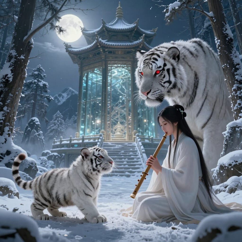 A serene digital matte painting depicts a woman and a white tiger cub arriving at a glass building in a snow-covered forest, bathed in moonlight. A mother tiger emerges, creating a scene of acceptance and ancient secrets.
