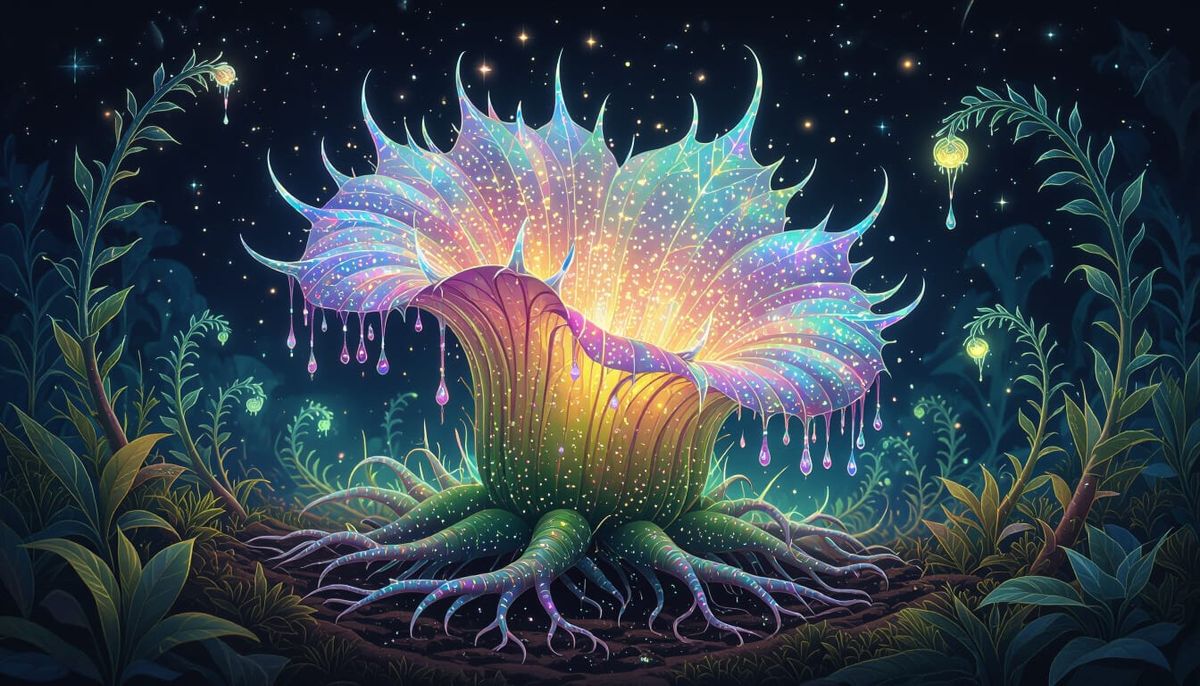 This image showcases a fantastical, highly detailed botanical illustration of a magical carnivorous plant. It features iridescent petals, crystalline thorns dripping light, and floating roots, all rendered with vibrant, otherworldly colors.