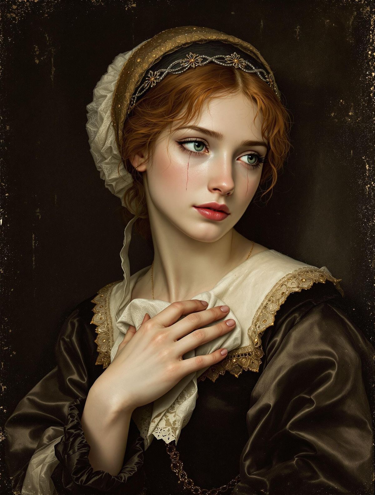 This image shows a sorrowful teenage girl in Tudor attire. Her tear-streaked face is softly illuminated with auburn hair and a dark satin gown, rendered with gold accents in a chiaroscuro style.