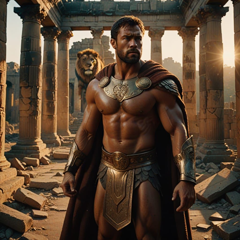 A hyperrealistic medium shot of Hercules in a ruined temple, wearing a lion-skin cloak. Golden hour lighting creates a warm, epic atmosphere. Cinematic film still.