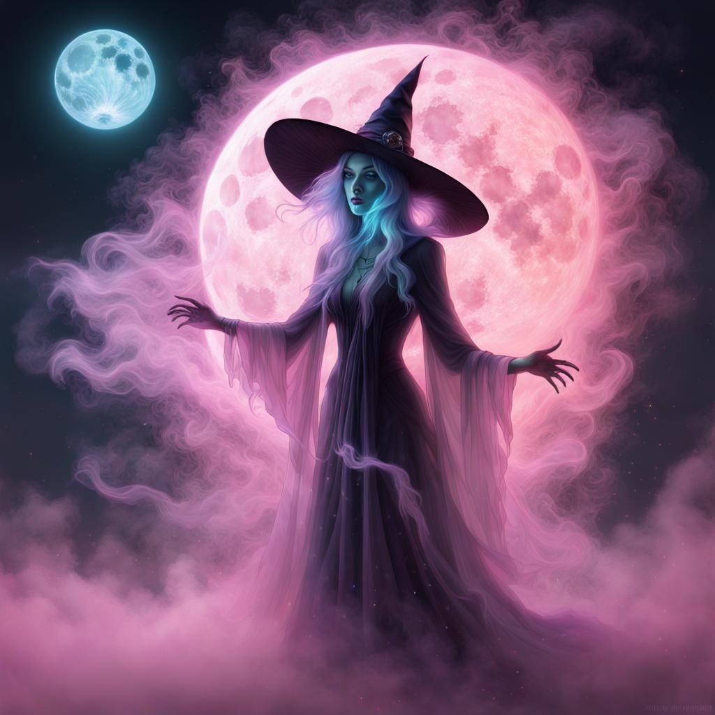 This image shows a spectral witch ghost floating in a misty, bioluminescent landscape. Opalescent, iridescent stars explode around the figure, set against a backdrop of pink ink smoke in ethereal ghostly art.