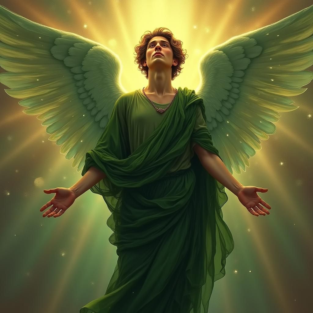This image shows Archangel Raphael with outstretched arms against a golden backdrop. The figure is depicted with magnificent green and blue wings and light skin, in the style of a Renaissance fresco.