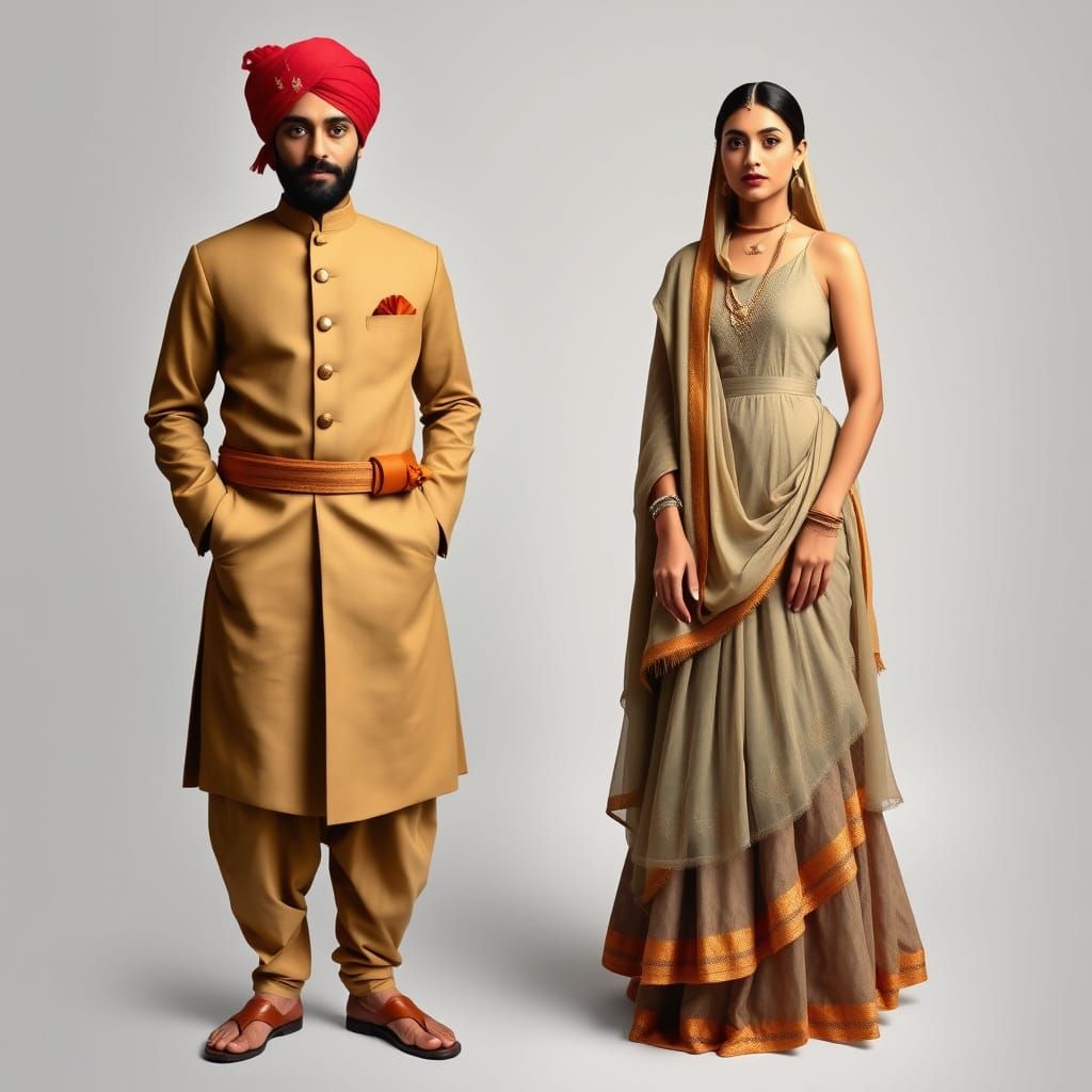 A portrait of a man and woman in traditional Indian formal wear. The composition and style are reminiscent of classical Indian painting, with rich colors and detailed garments.