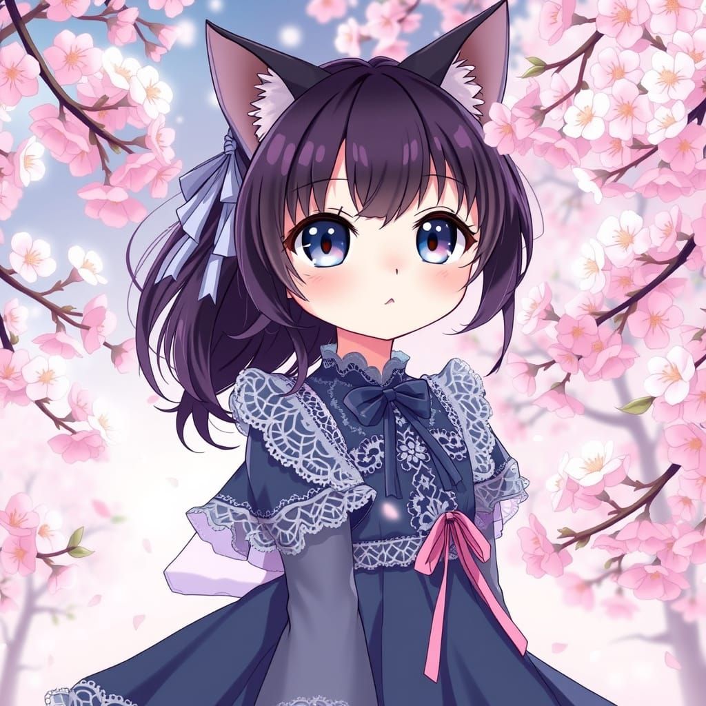 This image shows a magical anime cat girl surrounded by vibrant cherry blossoms in a soft, dreamy atmosphere, blending delicate lines and whimsical colors reminiscent of Makoto Shinkai's style.