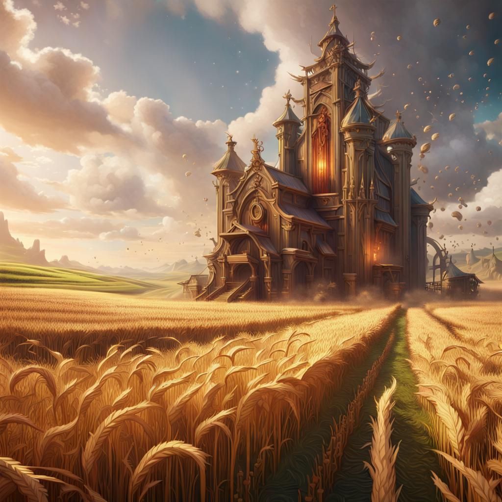 A vibrant matte painting of a bountiful field where the grain appears to sing. This digital artwork features deep colors and intricate details in a fantastical scene.