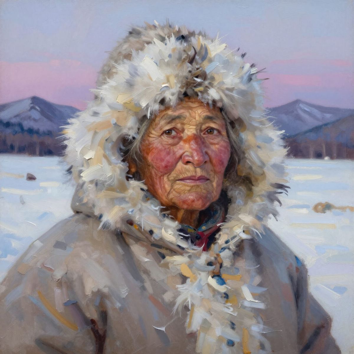 A richly textured oil painting of an elderly Inuit woman with expressive eyes and a traditional fur-lined hood. The portrait captures her weathered face and the luxurious texture of the fur, set against a soft arctic landscape.