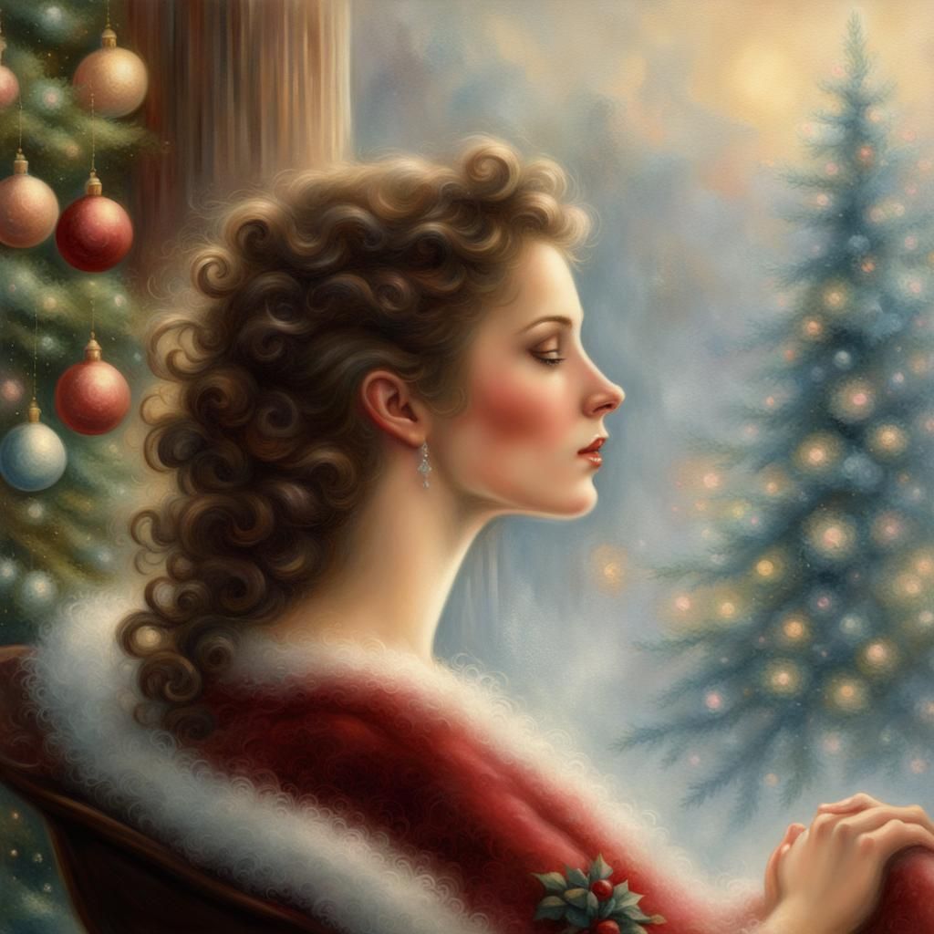 A hyperdetailed portrait of a woman in a Christmas fantasy setting. The image evokes a vintage aesthetic with ethereal mist, reminiscent of luminist paintings.