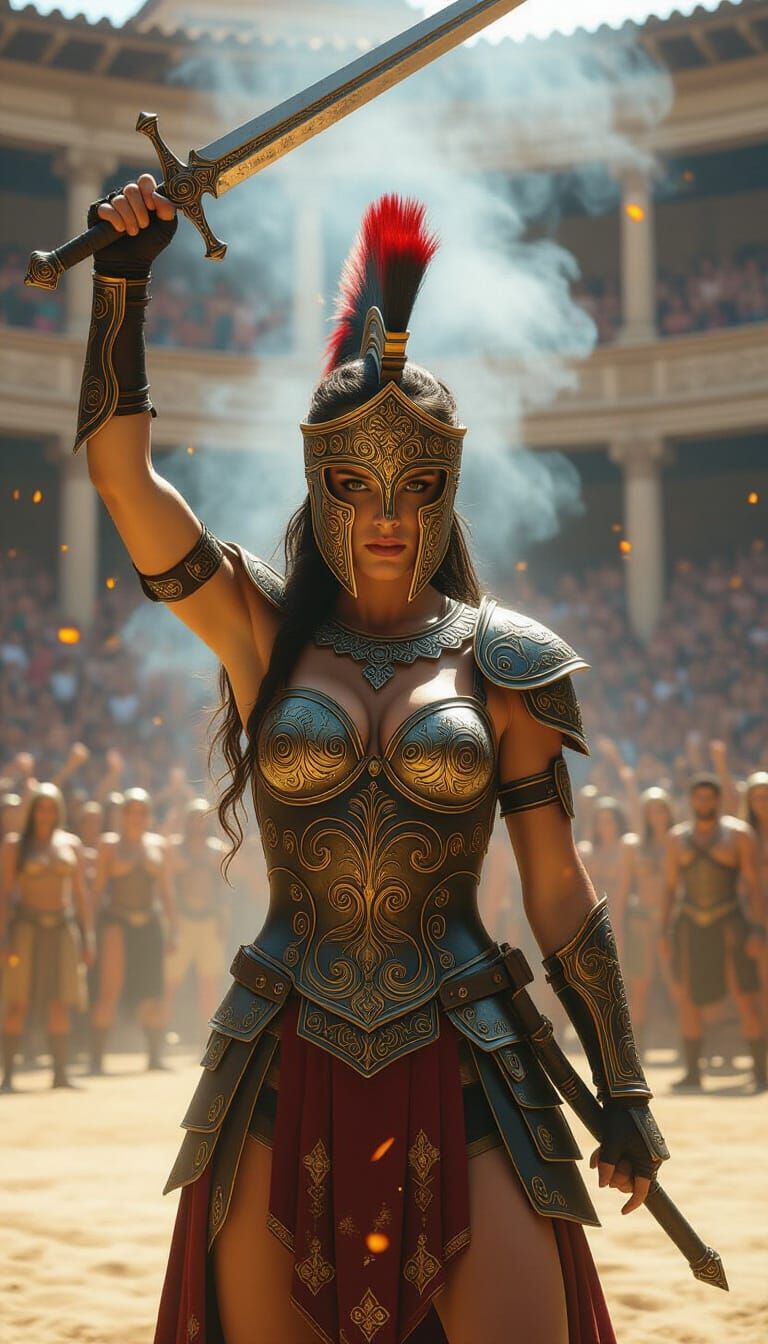 This hyperrealistic image depicts a determined female gladiator in a sunlit arena, her ornate armor shrouded in swirling smoke. Particles of light enhance the mysterious, beautiful scene.