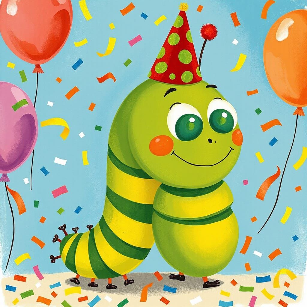 A cheerful caterpillar with a party hat celebrates amidst confetti and balloons. The image is reminiscent of children's book illustrations, featuring bold textures and bright colors.