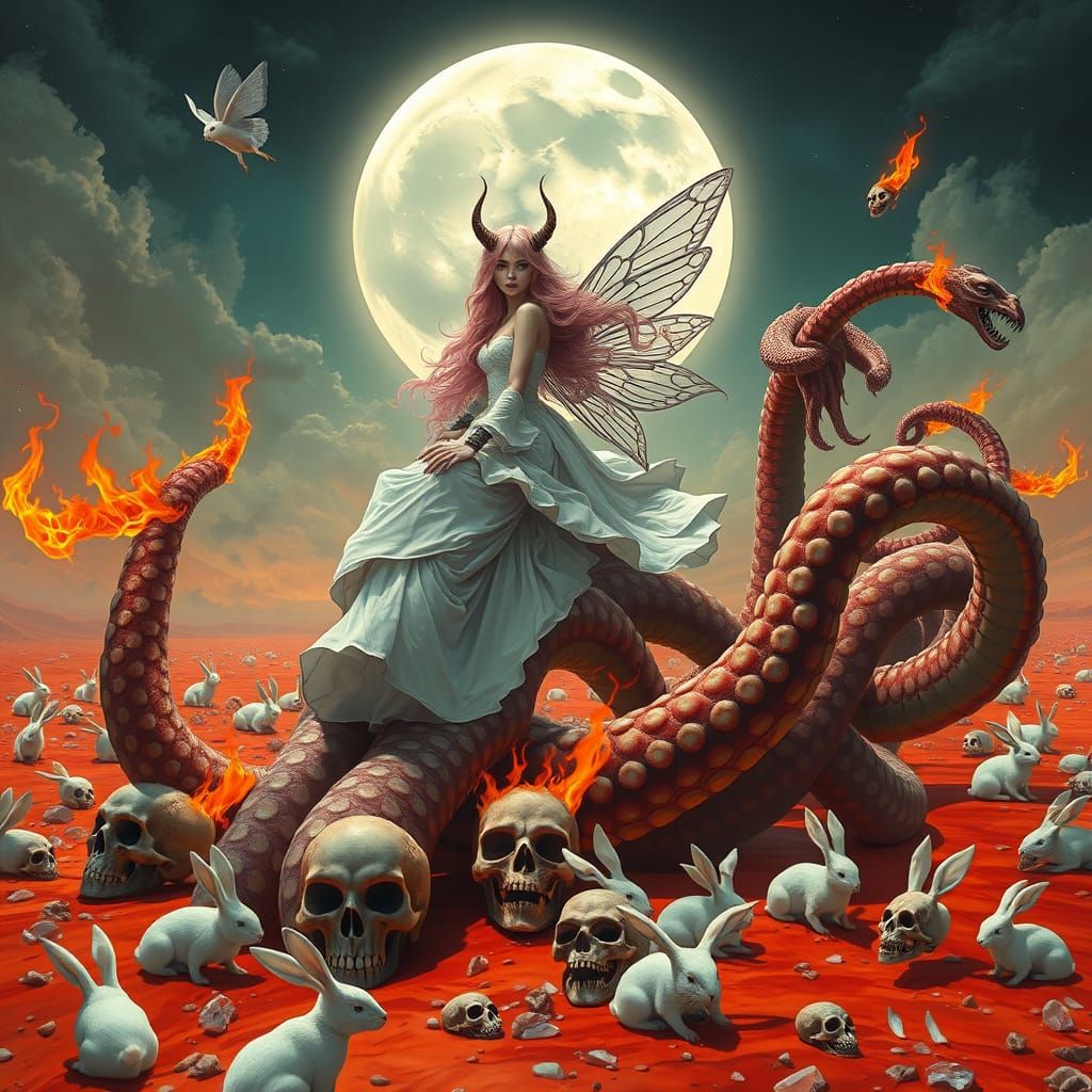 This image depicts a surreal scene of a woman with pink hair and burning horns riding an octopus, alongside another woman with snakes in her hair, set in a fiery desert landscape as digital art.