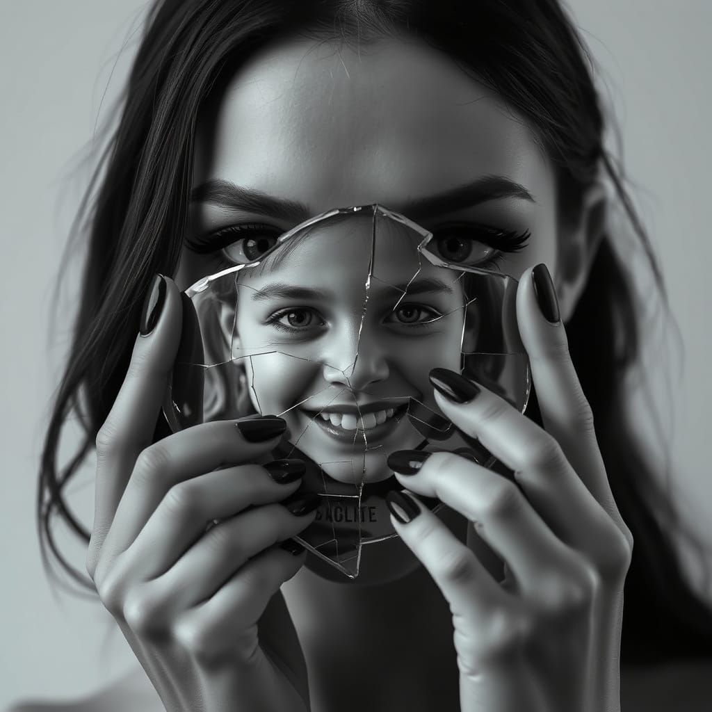 A striking portrait of a woman with captivating eyes holding a cracked mirror. The reflection reveals a smiling child, creating a surreal, melancholic yet hopeful scene in black and white.