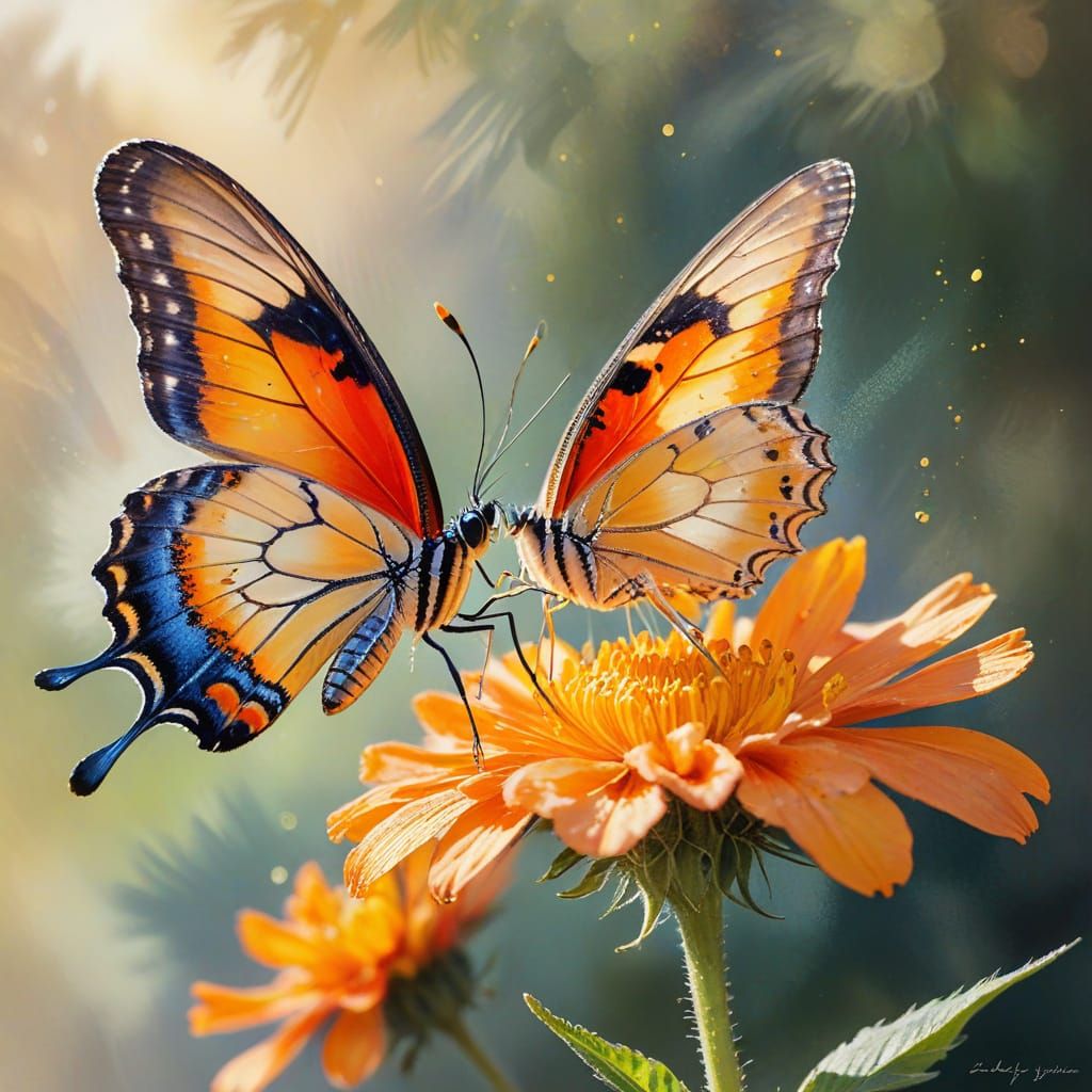 This image captures a close-up of a colorful butterfly sipping nectar from an orange flower in soft, impressionist watercolor style, featuring delicate petals, vibrant hues, and a whispy texture.