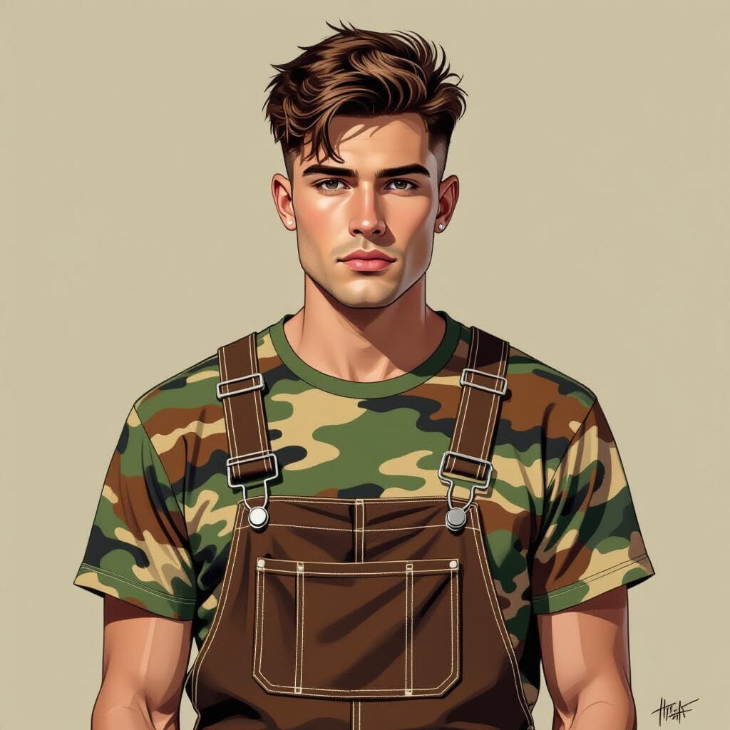 This image showcases a young man in urban camouflage and denim overalls, featuring a distinctive haircut. Rendered in a graphic novel style with bold lines and vibrant colors.