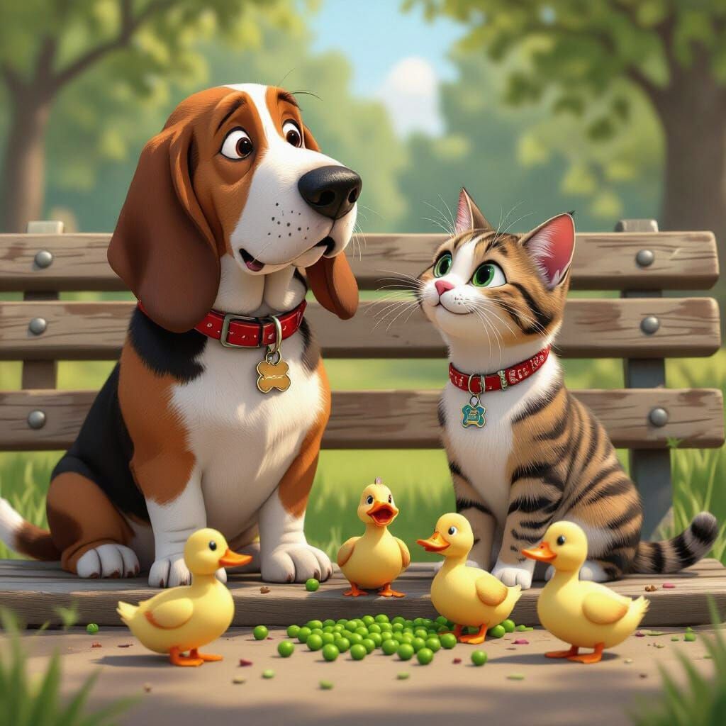 This image shows an old basset hound and tabby cat sharing a weathered park bench. They are feeding frozen peas to a gaggle of quacking ducks in a vibrant, soft textured 3D cartoon style.