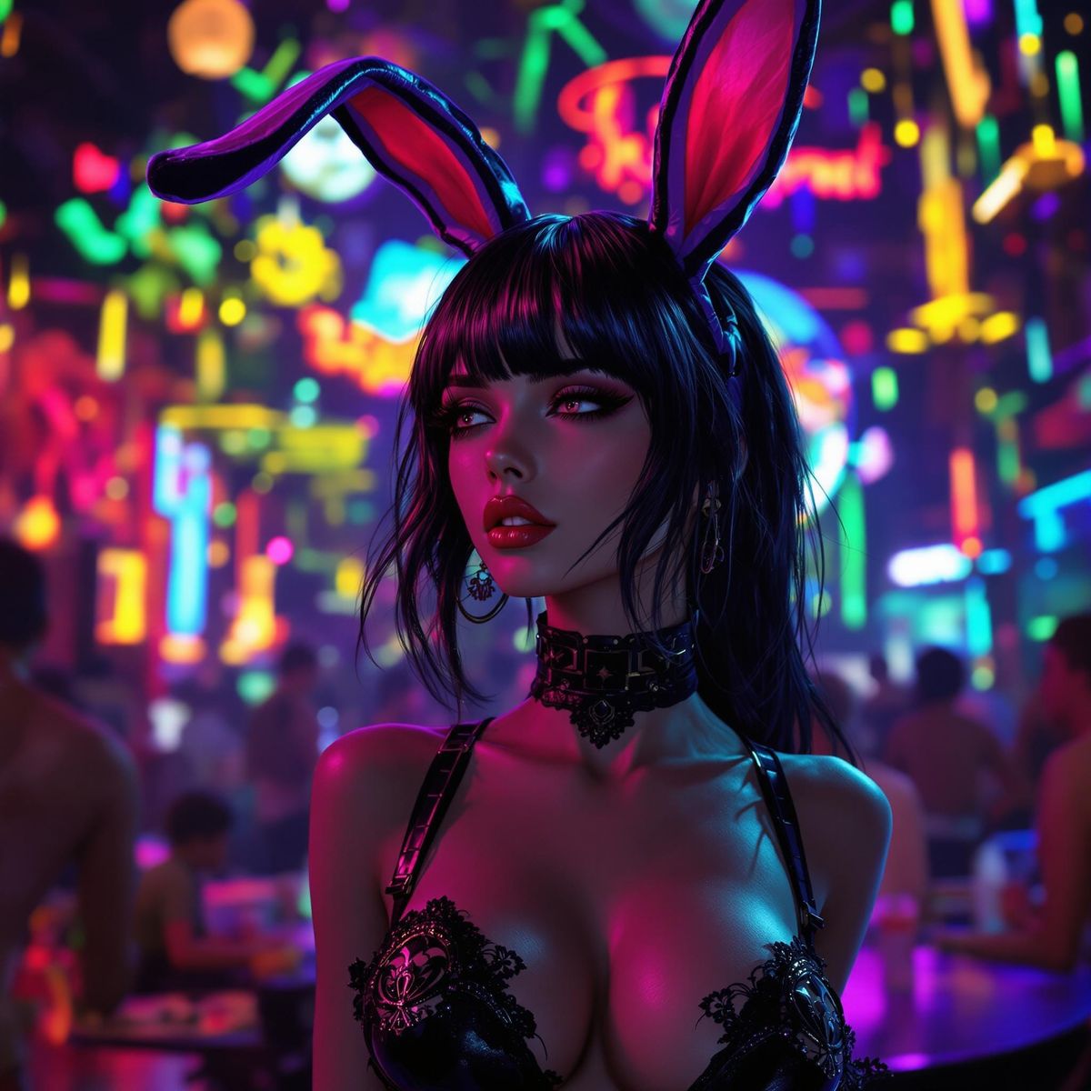 A striking portrait of a slender, bored woman with black hair and bunny ears, set in a nightclub. This digital artwork features dramatic lighting and hyper-realistic details, evoking high-end splash art.