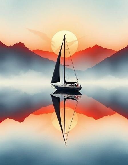 This image shows a sailboat on a lake at sunset, with mountains in the background. Reflected in the still water, the mountains and boat are presented as sumi-e ink painting with bold accents.