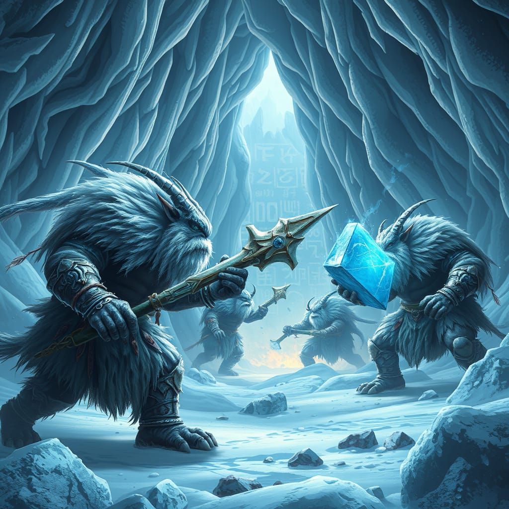 A battle scene in an ice cave featuring armored trolls with glowing weapons. The cavern is lit by bioluminescent icicles and surrounded by frost spirits in a highly detailed 3D style.