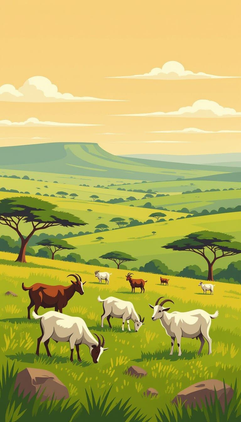 A vibrant digital illustration of goats grazing on a green African plateau with rolling hills and acacia trees under a sunny sky. The artwork has an expressive, surreal and earthy aesthetic.