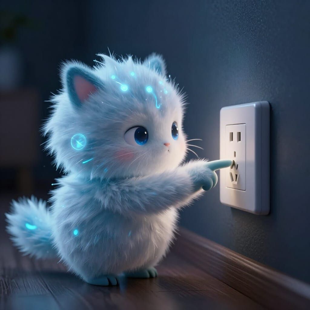 This image shows a fluffy, cute electric creature being energized by placing its fingers into an electrical socket in a dimly lit room.