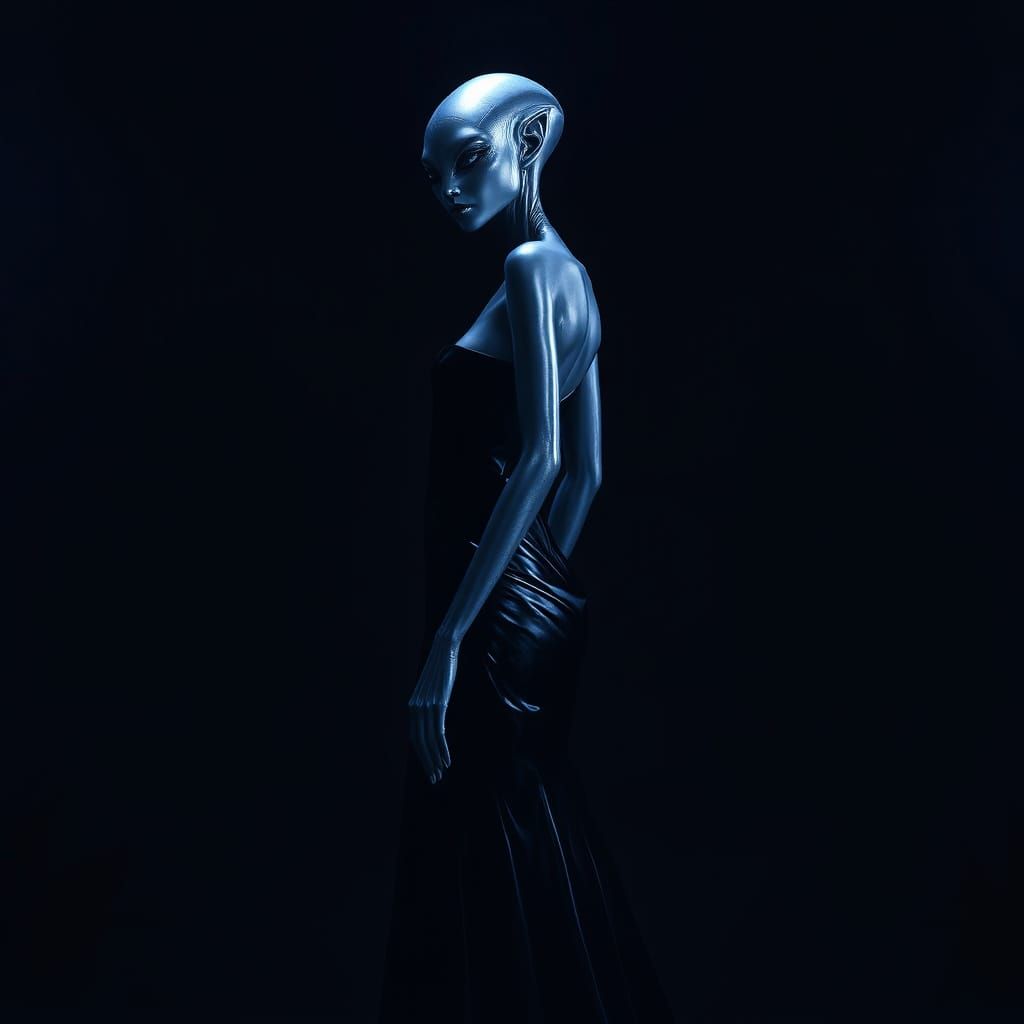 A striking silver alien woman in a black gown within a minimalist room. Ethereal blue and purple lighting creates a moody, sophisticated, and mysterious atmosphere. Cinematic concept art style.