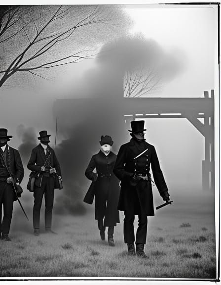 This image captures a dramatic moment of Edie Sedgwick and Andy Warhol visiting Abraham Lincoln in a misty Civil War battlefield, surrounded by smoke and fog. Inspired by the works of Diane Arbus and Bill Brandt, this vintage-style photograph features high contrast, muted greys, and a dark, moody atmosph...