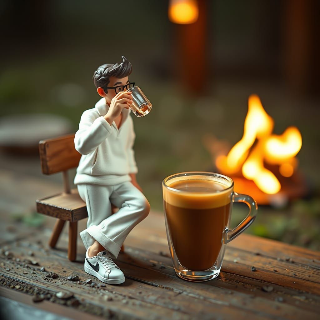 A whimsical image shows a miniature man drinking from a steaming espresso cup. This 3D render features realistic textures and warm tones, reminiscent of Pixar animation.