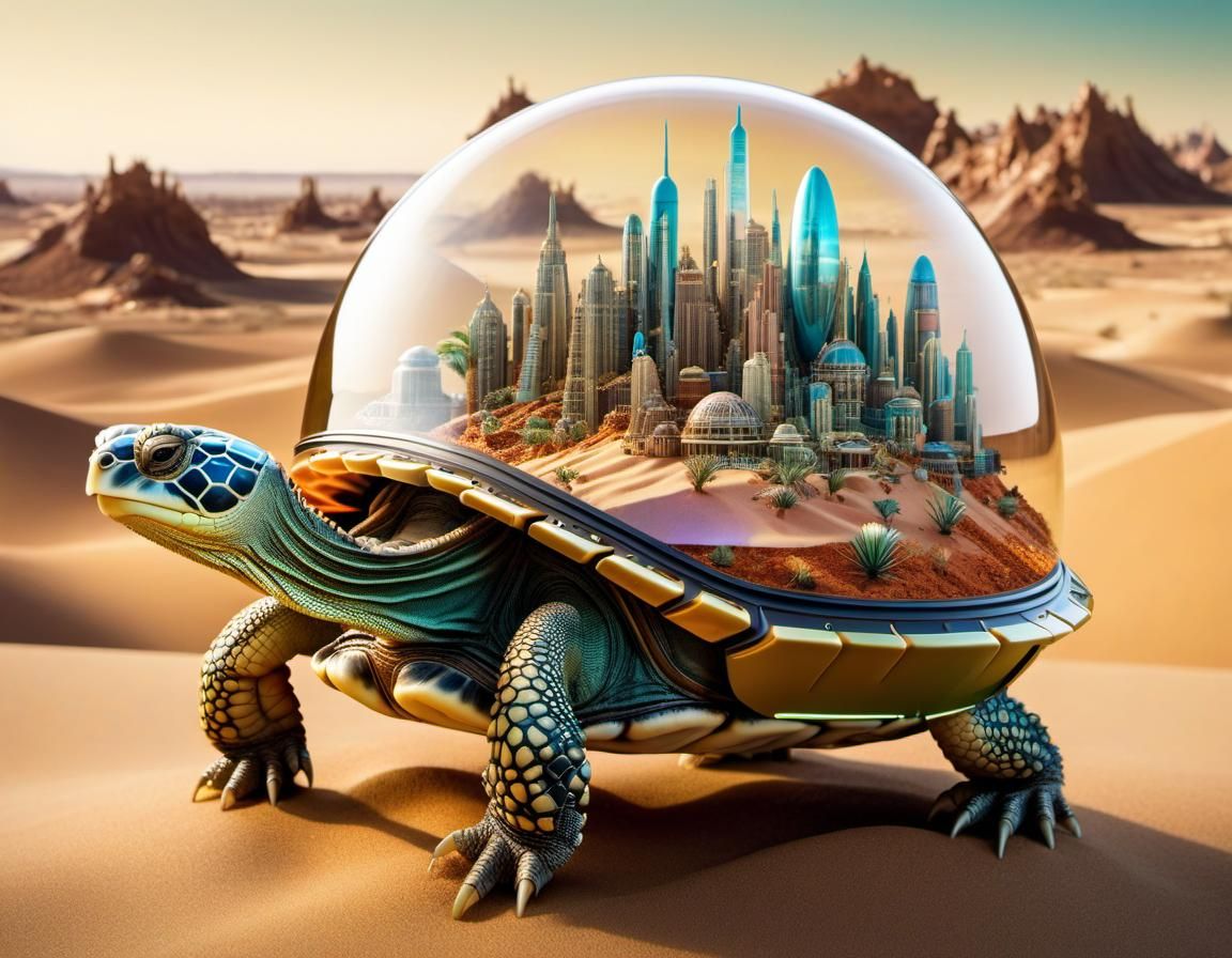 A surreal image of a glass tortoise containing a miniature futuristic city. The desert scene showcases intricate details and a hyperrealistic style, resembling digital art.