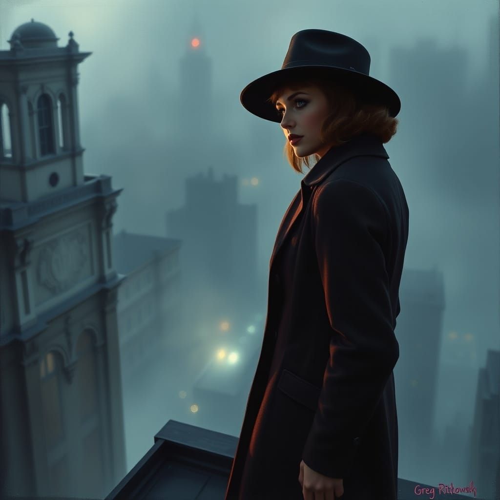 This image depicts a woman on a San Francisco rooftop, experiencing vertigo. The artwork features dramatic lighting, atmospheric fog, and a dark, moody aesthetic reminiscent of cinematic and dark fantasy styles.