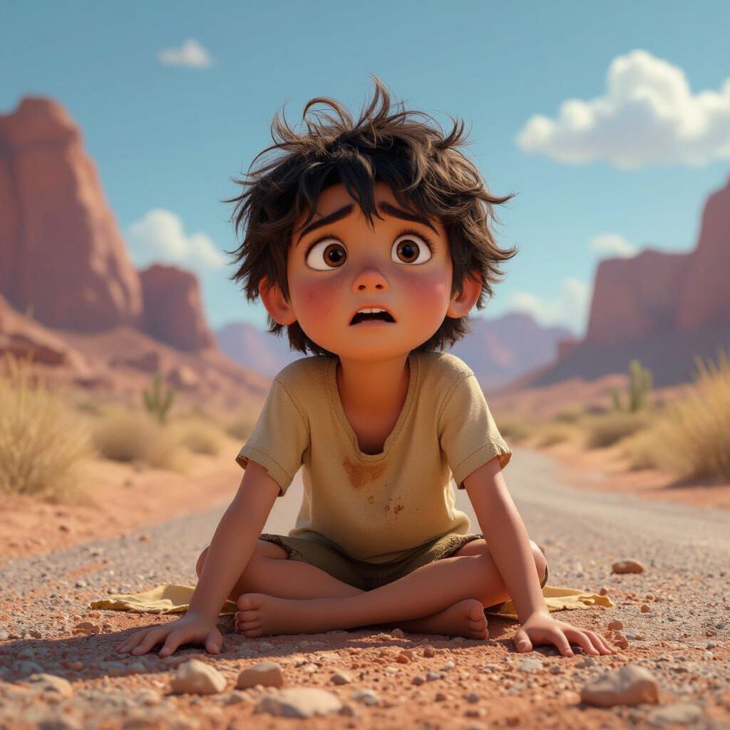 This image depicts a wounded child collapsed on a desert road. The style evokes Disney Pixar animation, with detailed textures, dramatic lighting, and a sun-baked color palette.