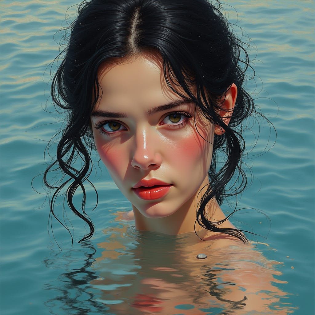 This image depicts a woman with a distorted, glitching expression, reminiscent of a digital signal disruption, as if reflected in rippling water, with bold brushstrokes and vivid colors, in a futuristic, impressionist style