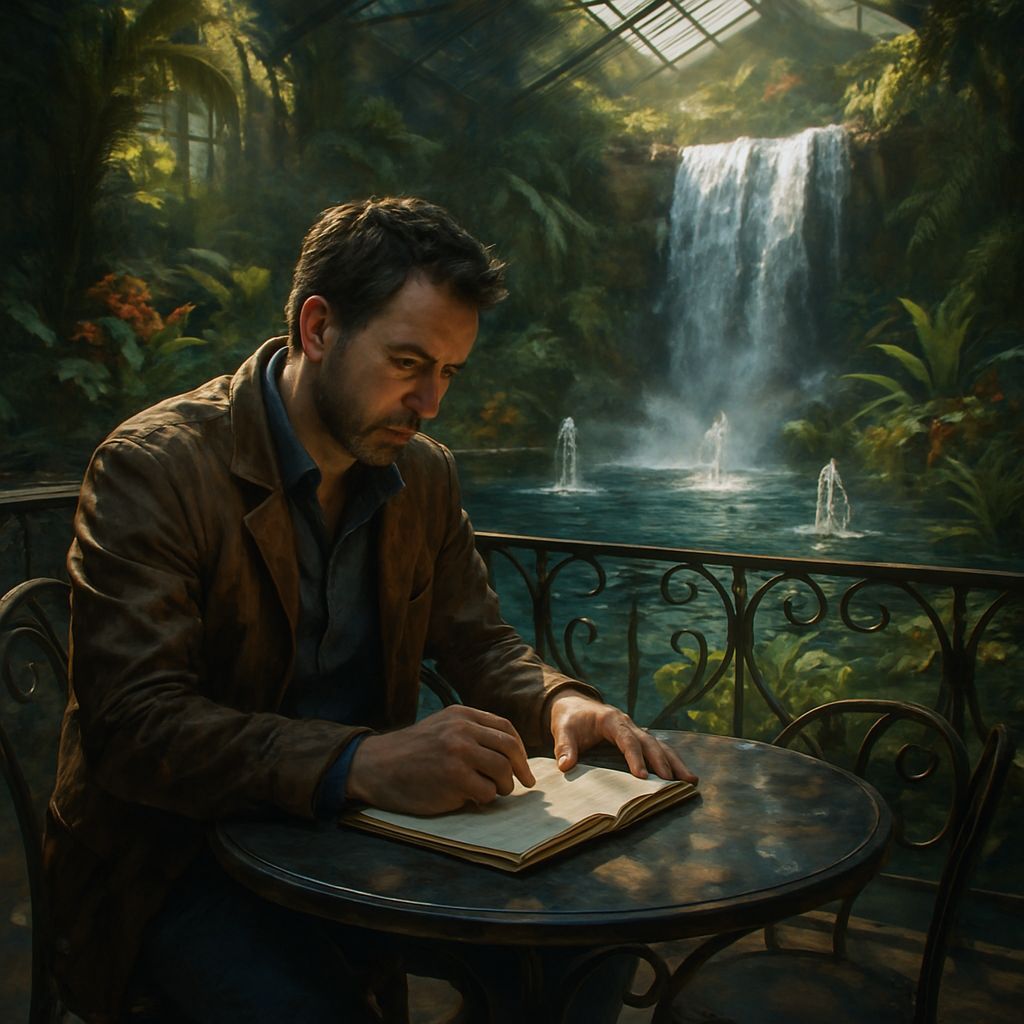 A hyperrealistic scene of an indoor water garden with a pool, waterfall, fountains, and lush plants. A man writes in a journal by the water, illuminated by skylight.