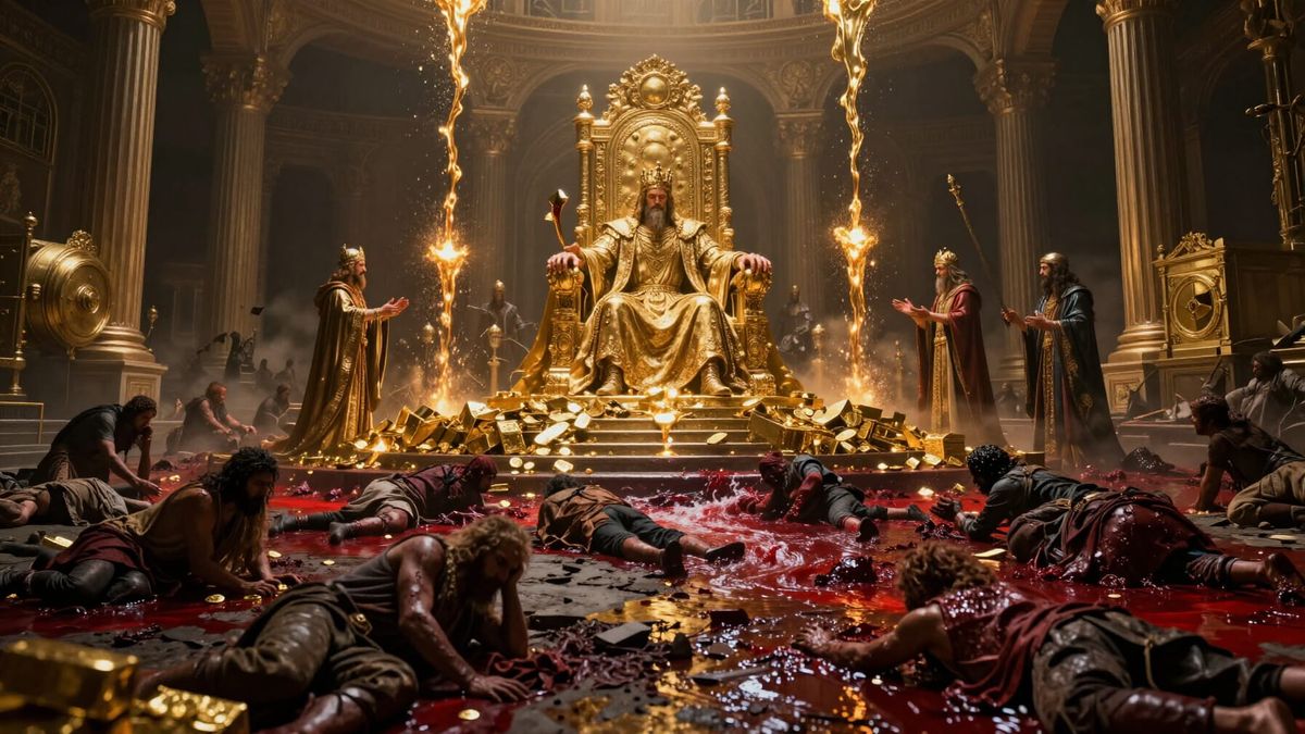 A dark, cinematic image depicting the high cost of wealth and power. A grand golden throne overlooks a battlefield where rivers of blood flow beneath streams of molten gold, symbolizing exploitation and oppression.