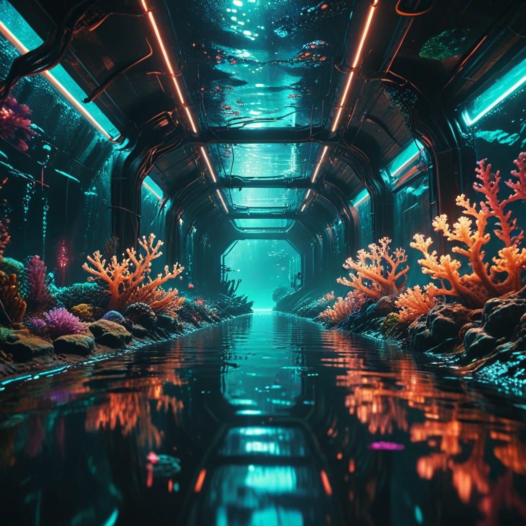 This image shows a futuristic underwater tunnel bathed in soft neon light. The tunnel is designed for pedestrians and cyclists, with vibrant coral and marine life visible through shimmering water, in a cyberpunk aesthetic.