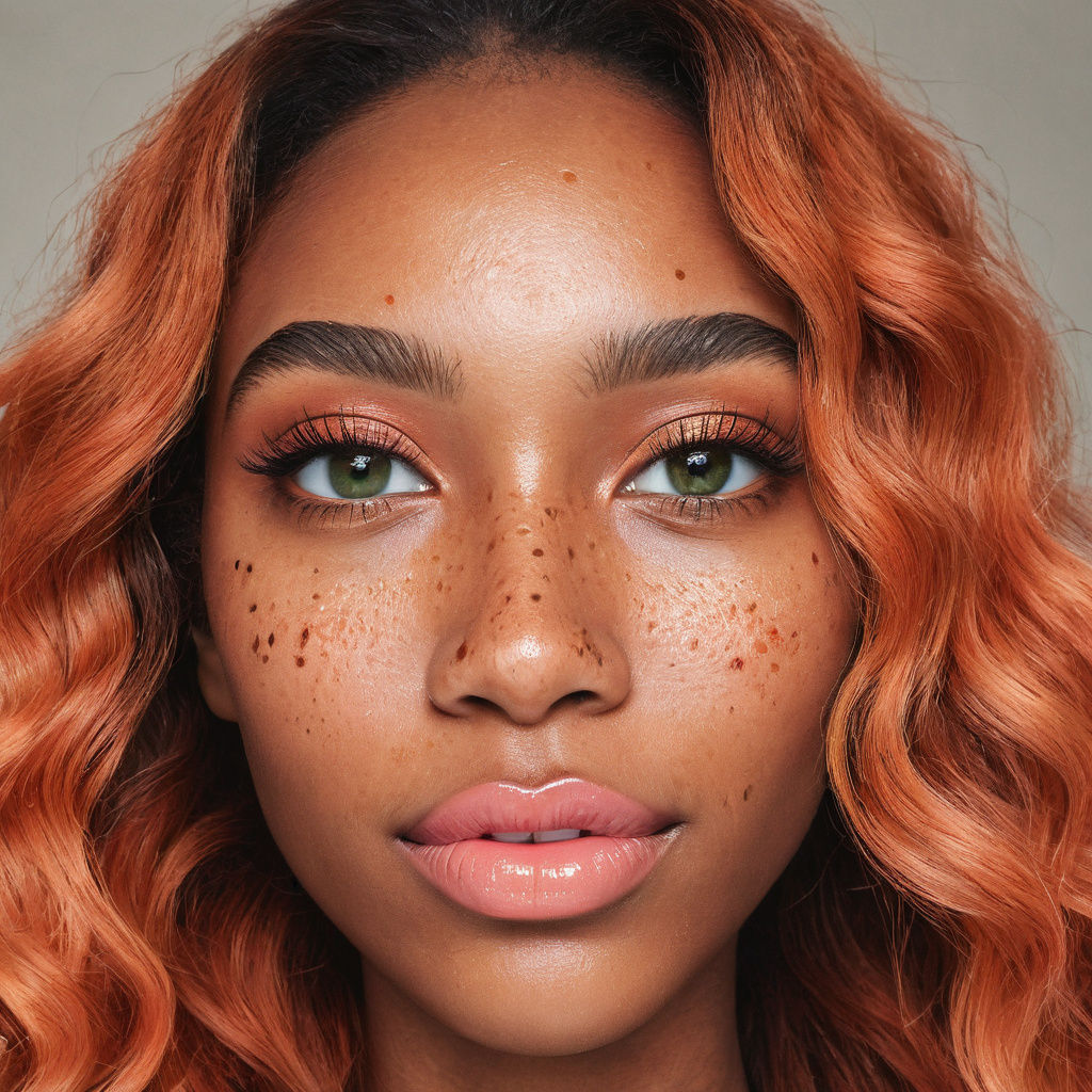 A stunning, iPhone-style selfie of a Black woman with loose orange-red hair, soft freckles, and warm green-hazel eyes. She's sitting in a car with a relaxed expression, surrounded by warm sunlight and soft highlights.
