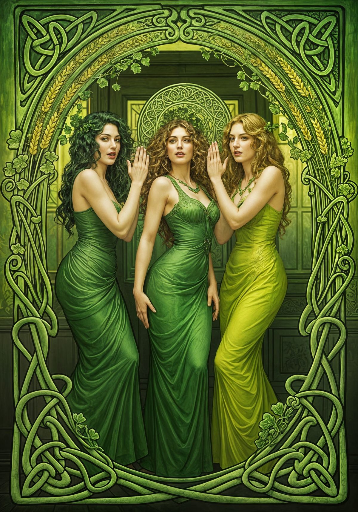 This image showcases an Art Nouveau portrait of four Irish women in a pub doorway. Their forms blend with botanical elements and Celtic knots, rendered in various shades of green.