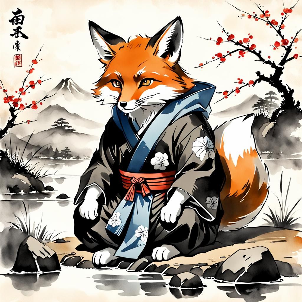 This image shows a traditional Japanese ink wash painting of the Inarai fox clan. The artwork captures the essence of Sumi-e with its minimalist and elegant style.