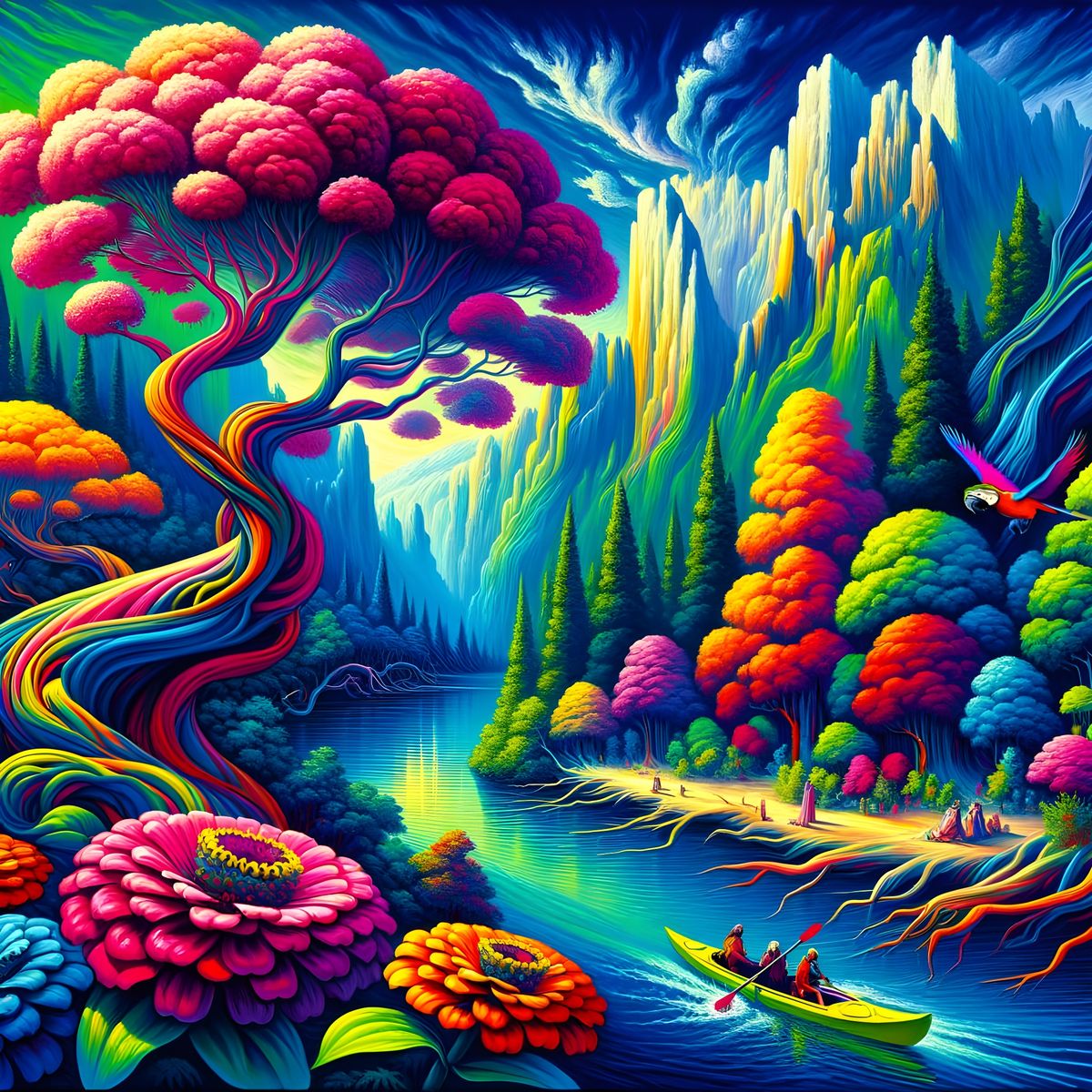 An oil painting capturing a dynamic, color-intense landscape. Features an electric blue river, acid green mountains, and trees in violent red and orange, with neon parrots and fuchsia zinnias.