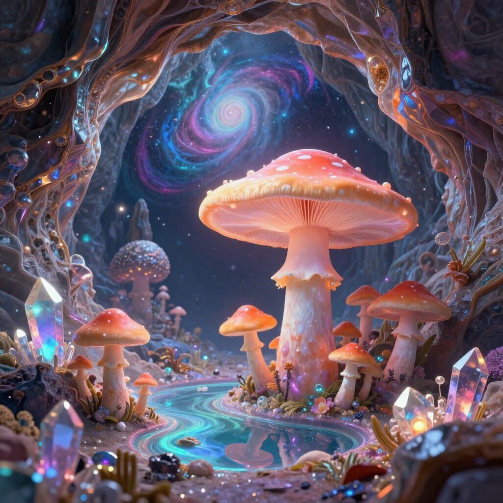 This image showcases vibrant pastel orange mushrooms in a gemstone cave, rendered with intricate details and ethereal light in a holographic astral style.