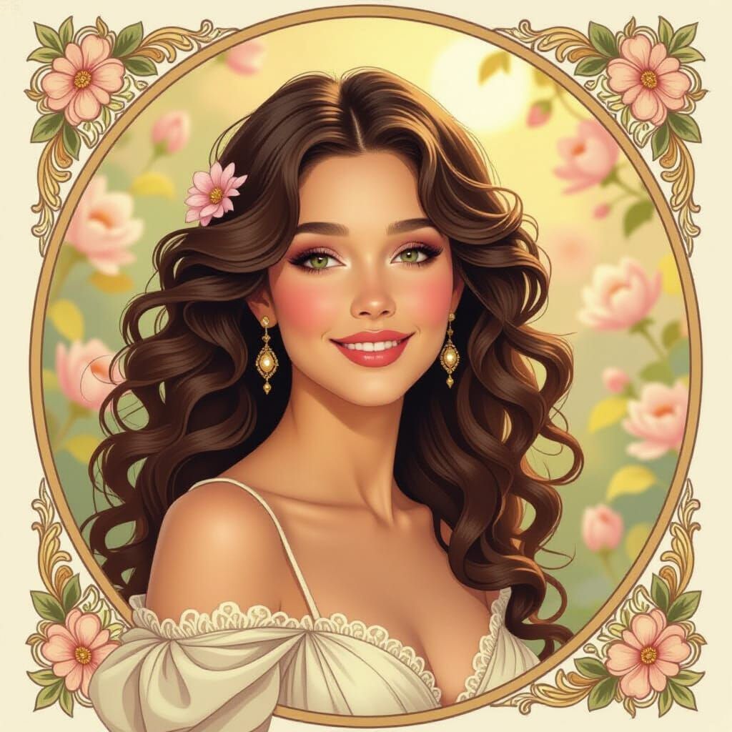 A portrait of a smiling woman with flowing curly hair and gentle eyes, set against a floral backdrop. The artwork is reminiscent of art nouveau with vibrant colors.