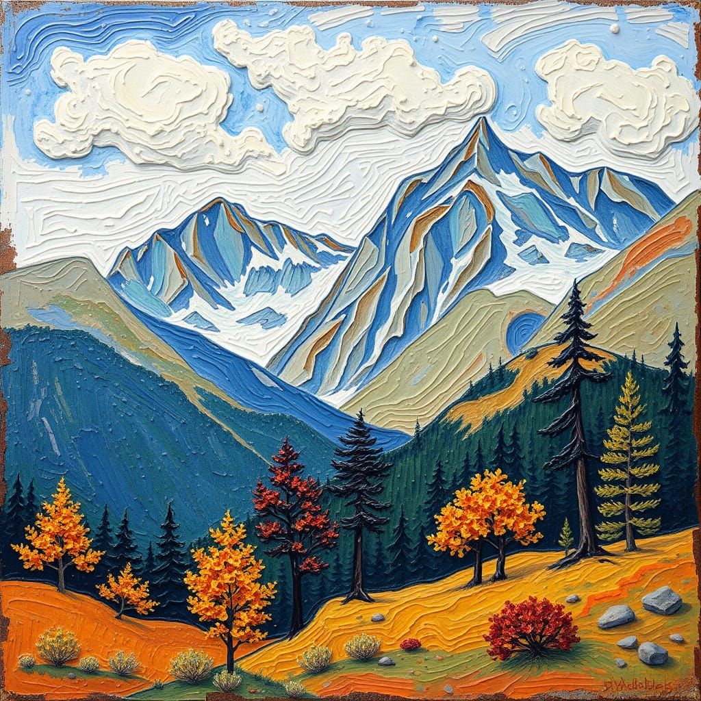 This image shows a vintage landscape painting featuring mountains and trees, rendered with thick, textured brushstrokes in a vibrant color palette. The artwork evokes an impressionist style.