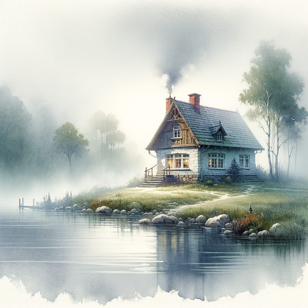 A peaceful landscape showing a charming cottage next to a still lake, surrounded by mist. The cottage has a warm, inviting atmosphere, depicted with soft colors and fine detail as a watercolor painting.