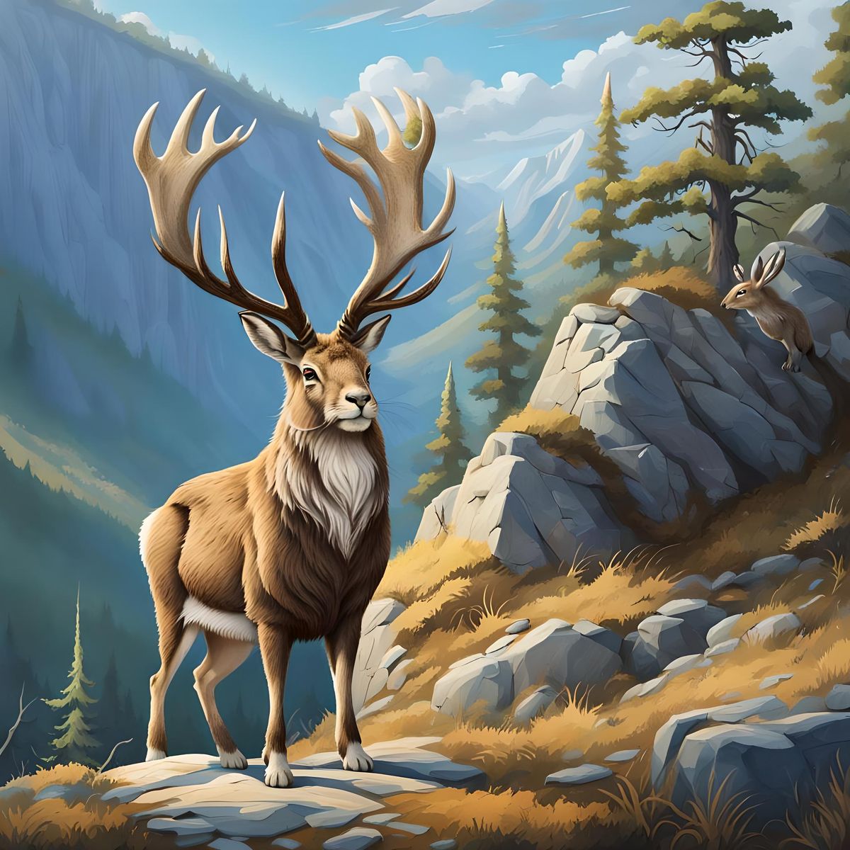 A majestic jackalope stands on a cliff overlooking an ancient forest. The mythical creature has the body of a stag, complete with antlers and mane, combined with the face and ears of a hare.