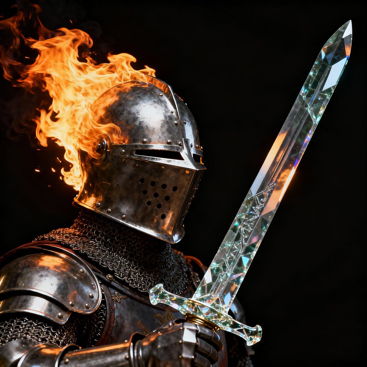 This striking image captures a knight in dramatic lighting, wearing a metal helmet with flames emerging and holding a glass sword. Rendered with high detail and dynamic lighting.