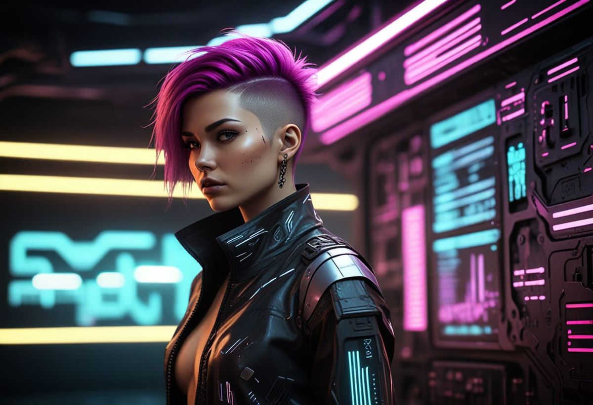 A confident woman with neon tattoos and a black jumpsuit stands in front of a dark, metallic hive, surrounded by high-contrast lighting and neon accents, in a gritty, high-tech cyberpunk world.