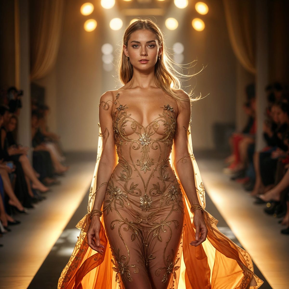 A gorgeous model wearing a high-fashion outfit in a glowing runway setting.